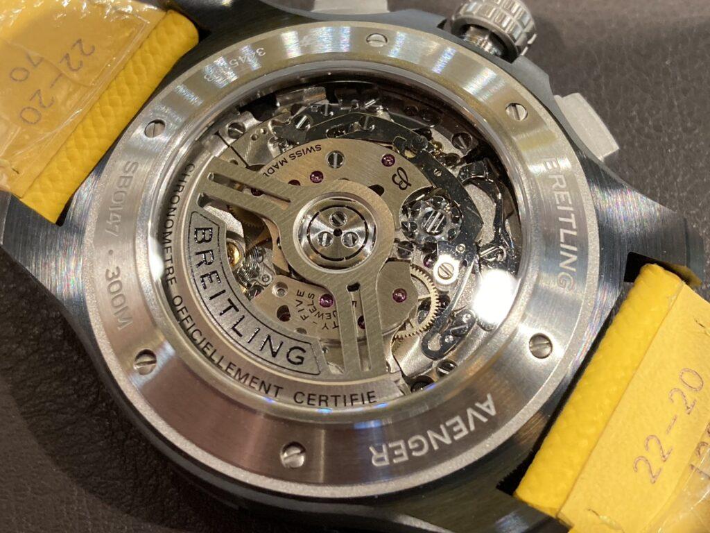裏がスケルトンで自社製のB01ムーブメントをご覧いただけます。