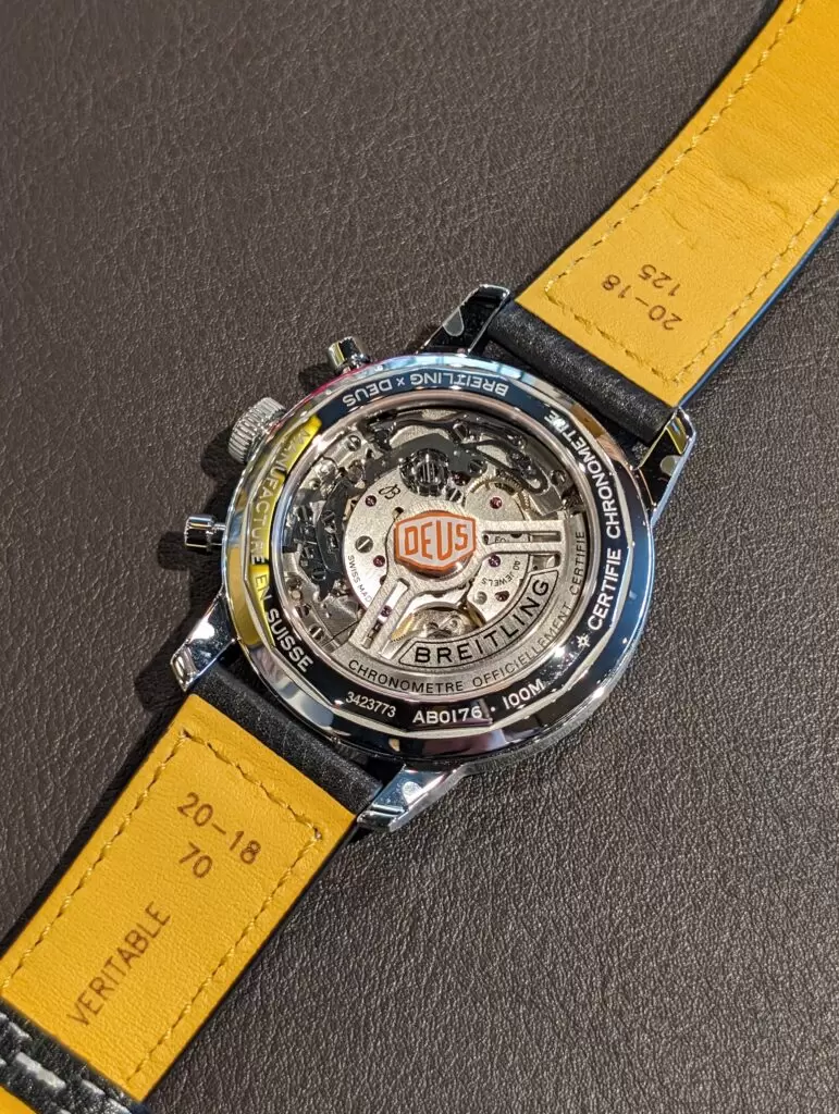 裏蓋は中の機械が見えるシースルーバック、真ん中にはデウスのロゴ。