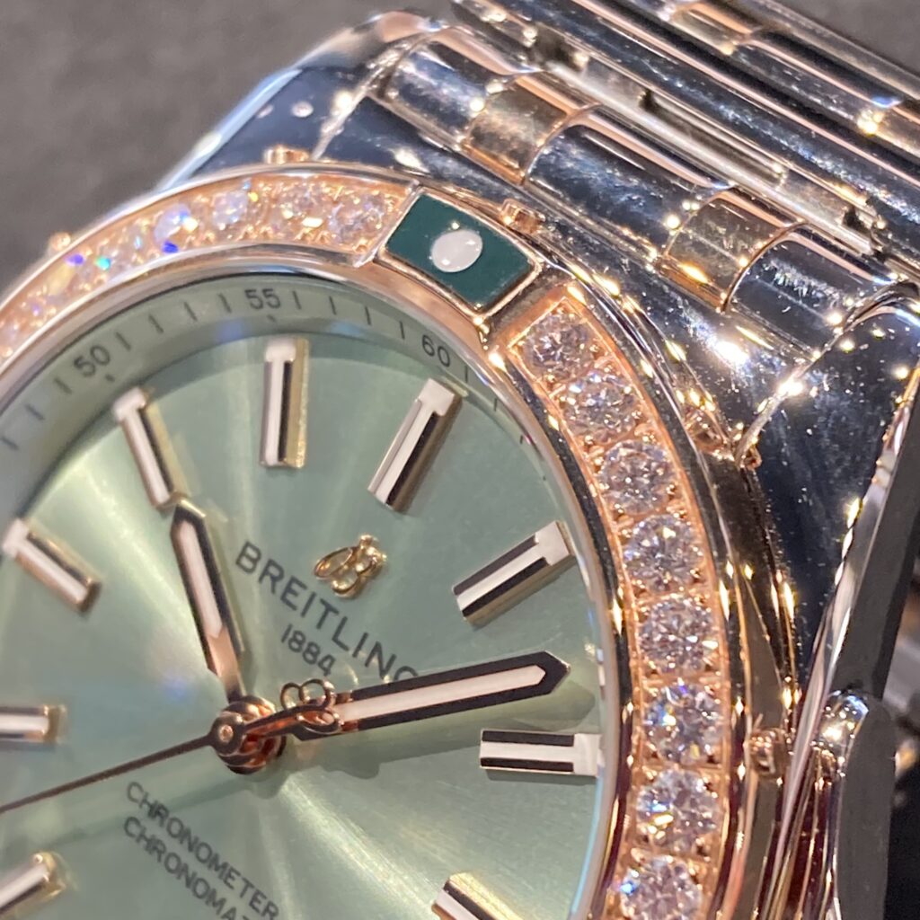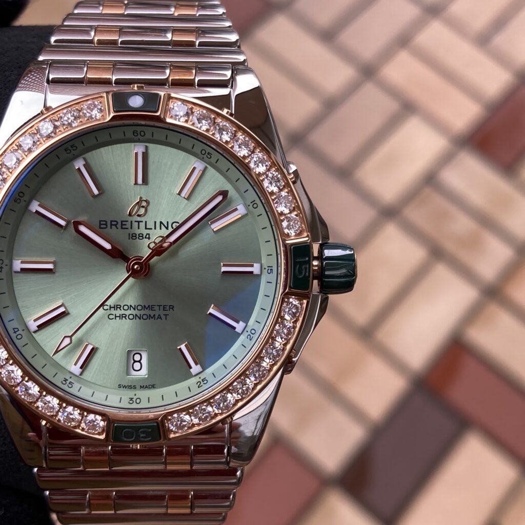 ベゼルとブレスレットにK18レッドゴールドをあしらい、ミントグリーンの清々しいダイヤルカラー