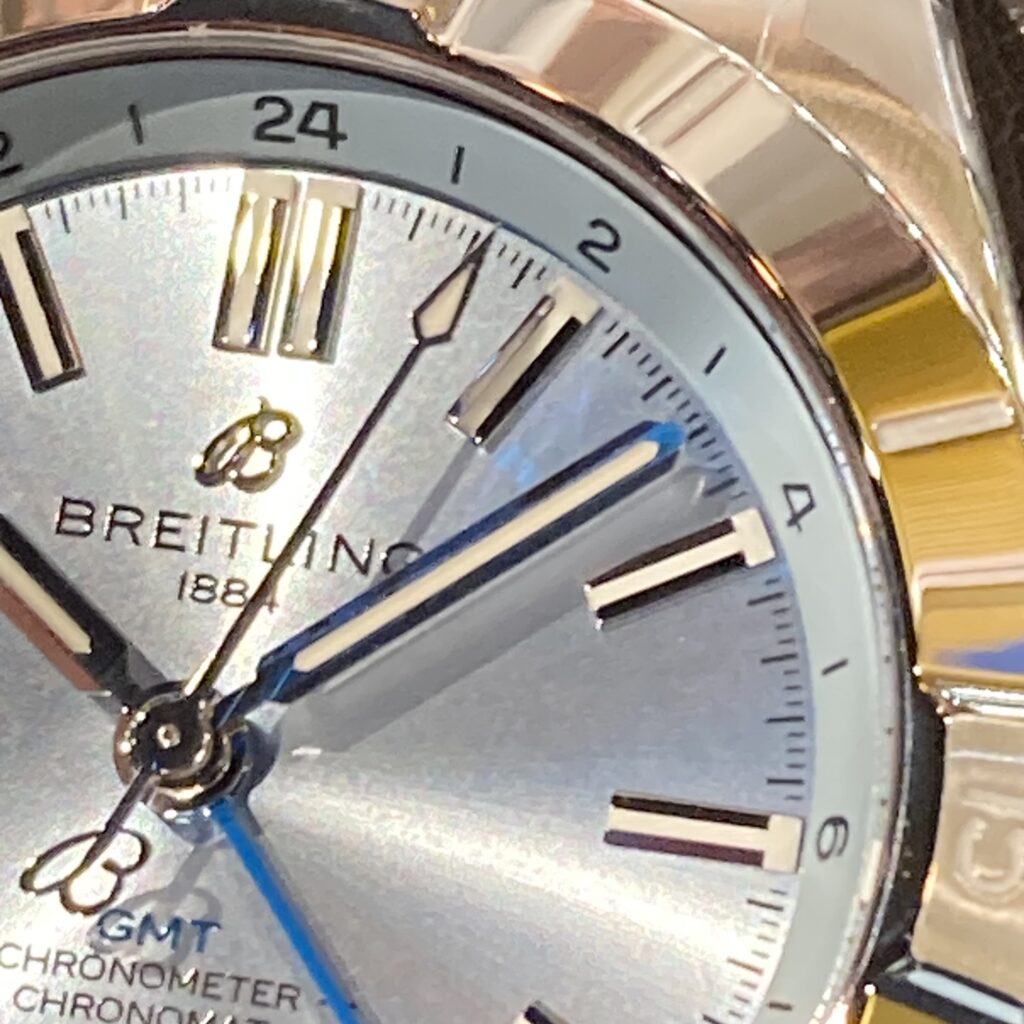 文字盤の造りがシンプルなので、非常に薄いアイスブルーがひと際映えます。ブライトリングと言えばクロノグラフですが