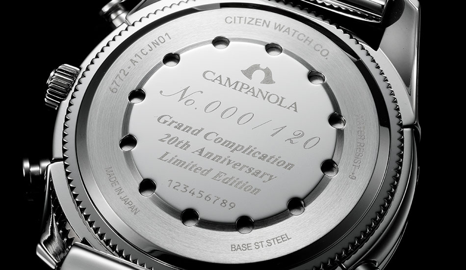 裏ぶたに限定120本を示すシリアルナンバーとグランドコンプリケーション発売20周年記念モデルを意味する刻印が入っています。