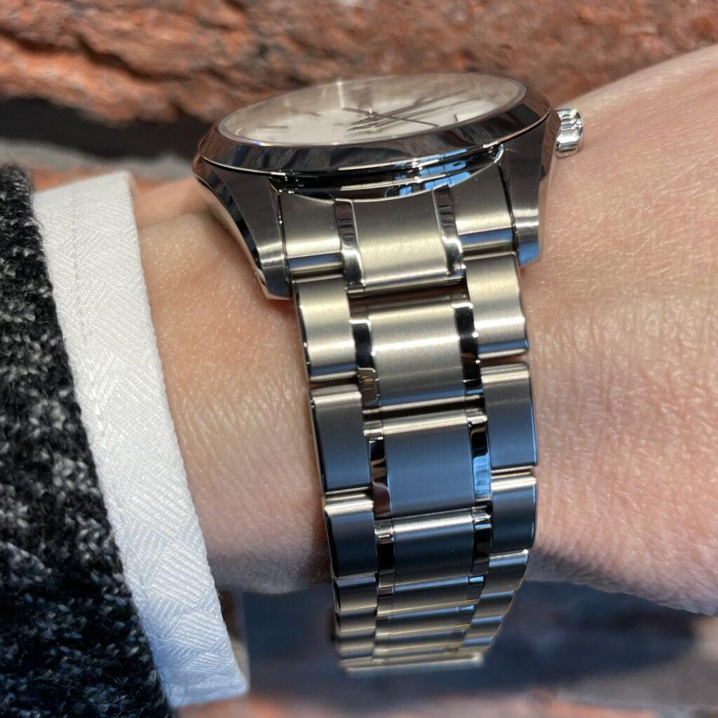 37mm径のケースとブレスレットには、通常のチタンよりも傷つきにくく、白く美しいブライトチタンを採用。