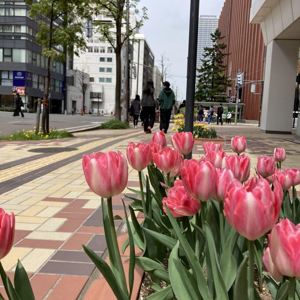 ブライトリングブティックの横の花壇には、綺麗にチューリップが咲いております。