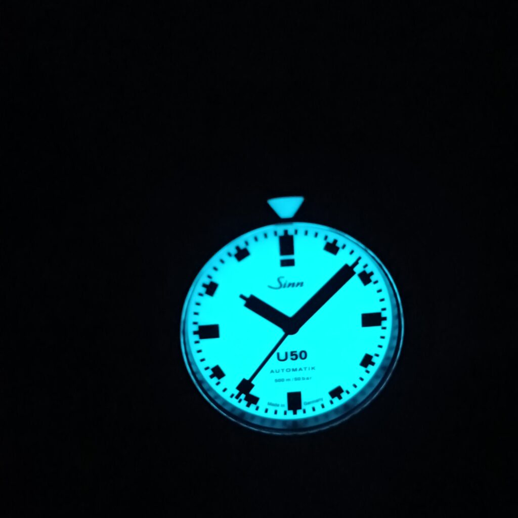 普通の時計は針が夜光塗料で光りますが、この時計は文字盤全体が特殊塗料で光ります。