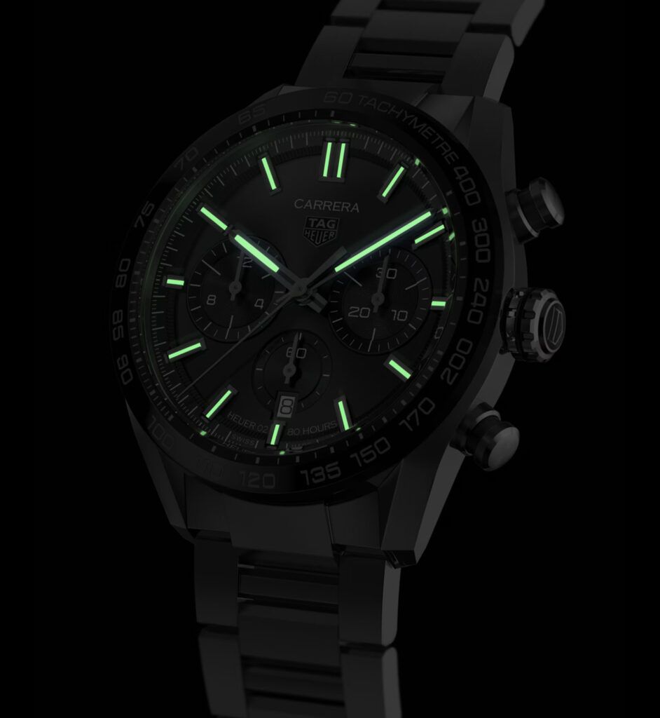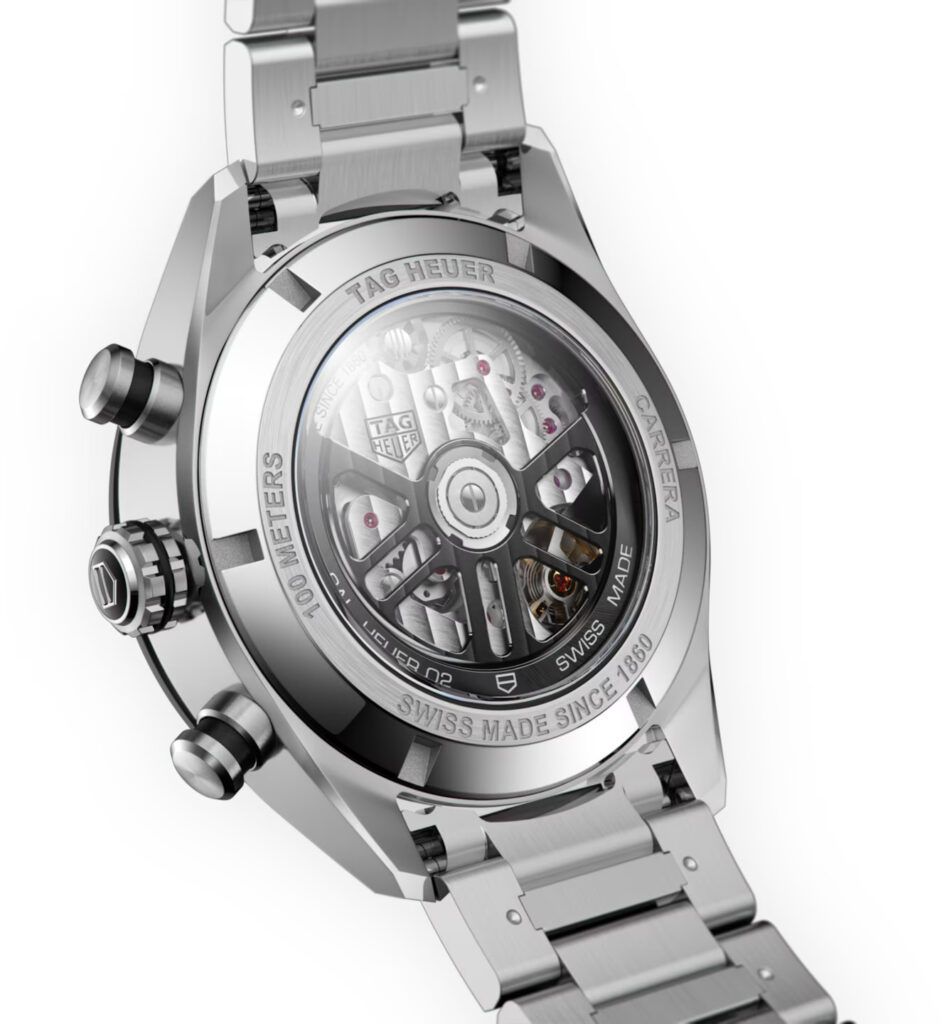 自社製ムーブメント「キャリバー ホイヤー02」が搭載されており、機能性の高さが際立っています。