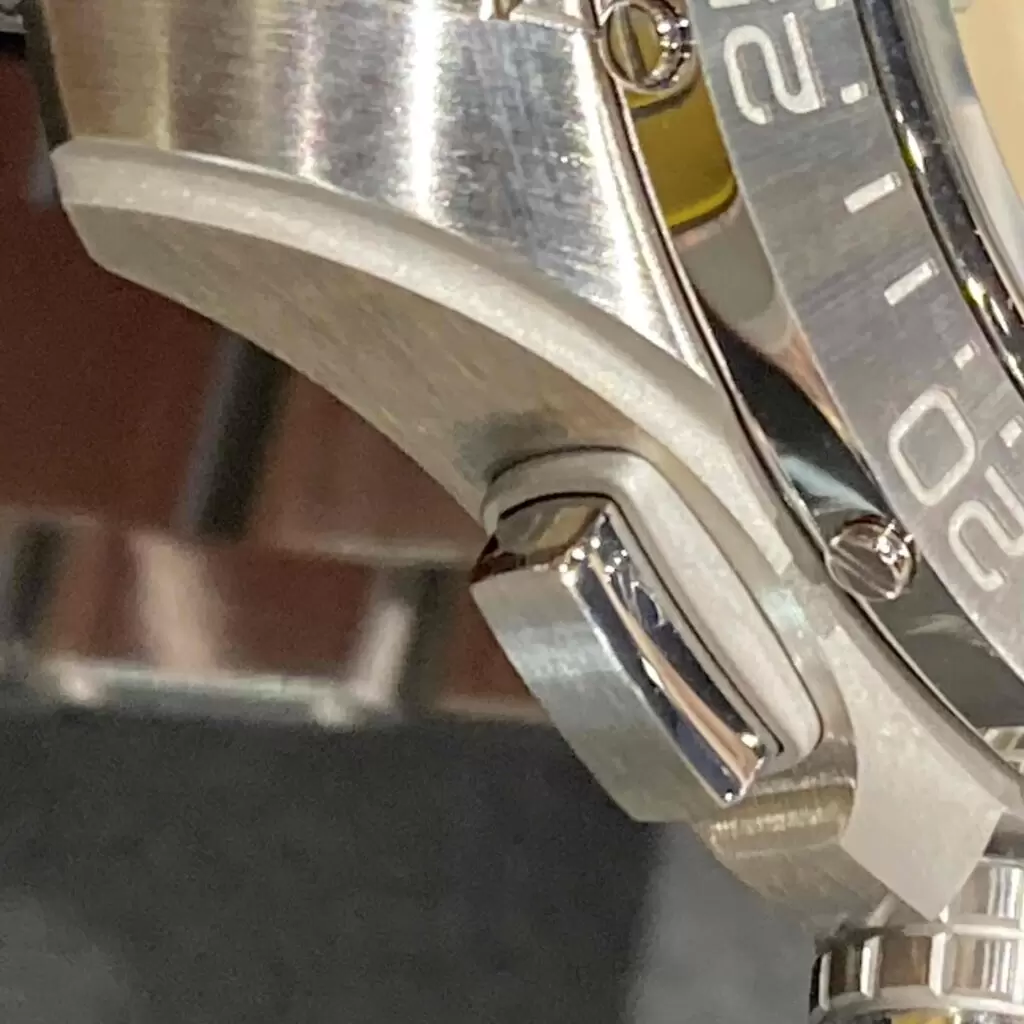 B01ムーブの搭載と、新しくなった長方形のプッシュボタンにより、防水性能をそのままにわずかに厚みを抑えられた本体。