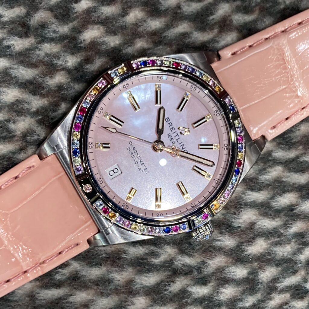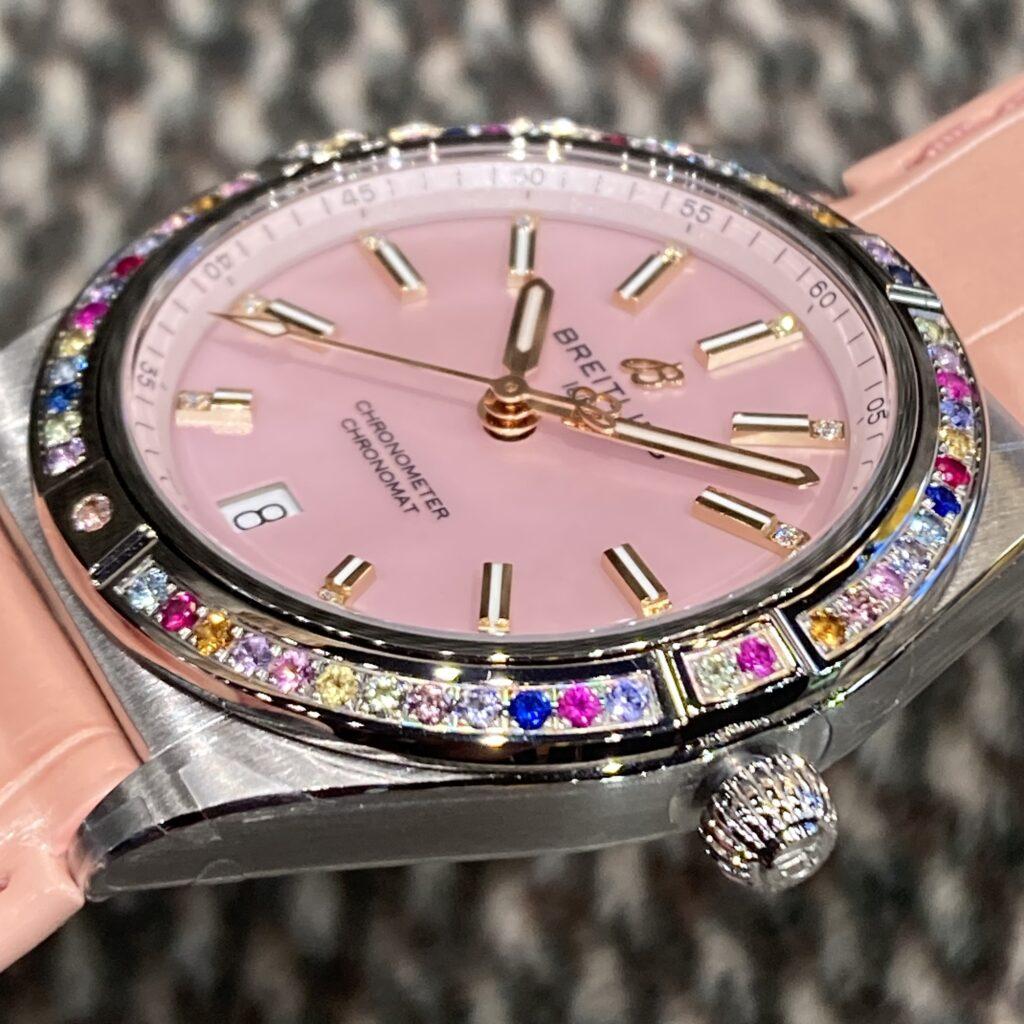 ひと際目を引くのがピンクのマザーオブパールのダイヤルと鮮やかな色合いの宝石をあしらったベゼル。