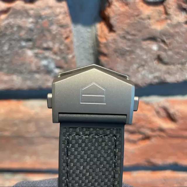 エンボス加工のブラックストラップは、レザーの高級感とラバーの実用性を兼ね備えています。