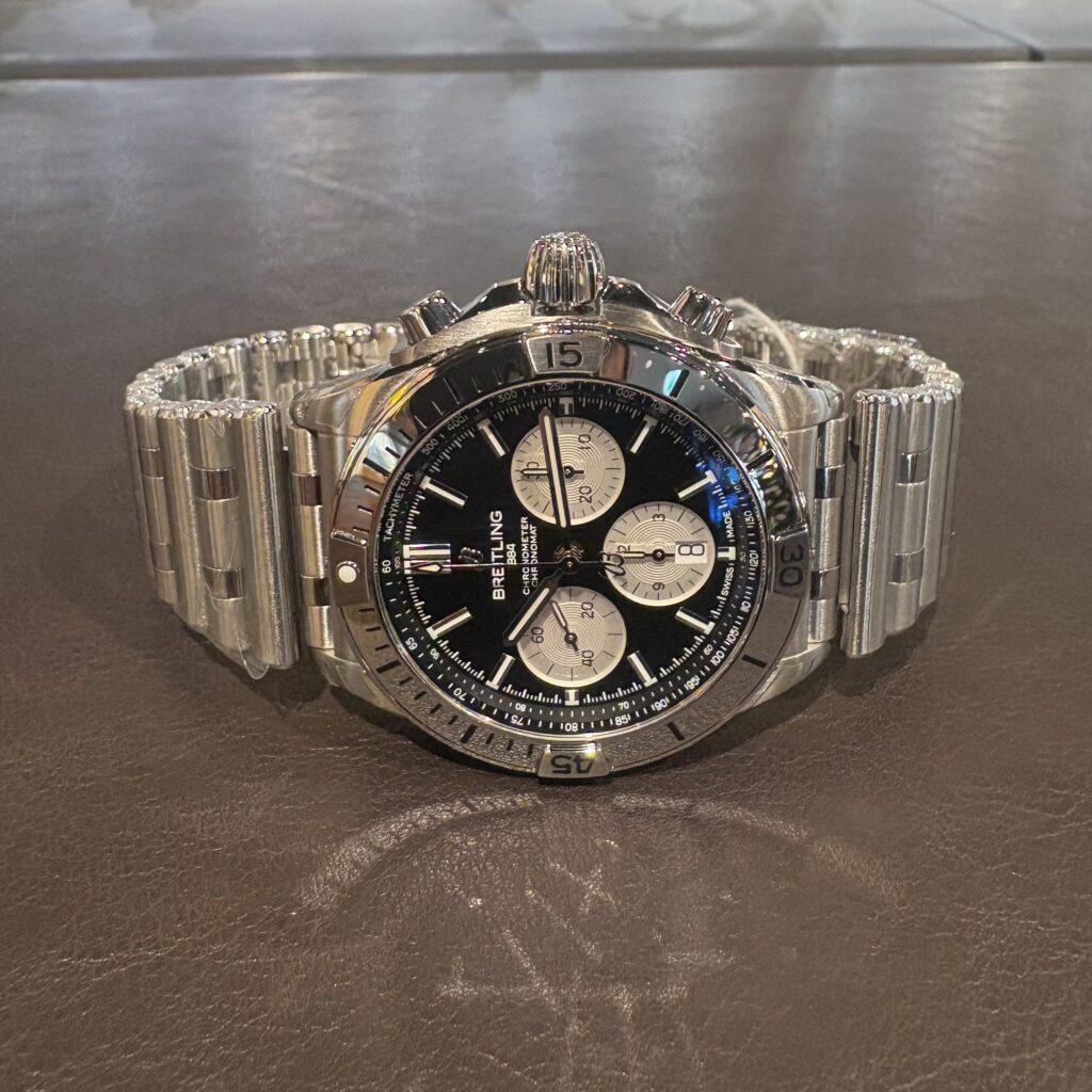 AB0134101B2A1は、クロノマット B01 42 ブラックダイヤルのステンレスモデル。精悍なブラックの文字盤に、シルバーのサブダイヤル(いわゆる“白目玉”)が映えるバランスの取れたデザインは、どの角度から見ても完璧。ステンレス製ルーローブレスの独特な光沢と装着感は、まさにクロノマットならではの存在感を放っています。