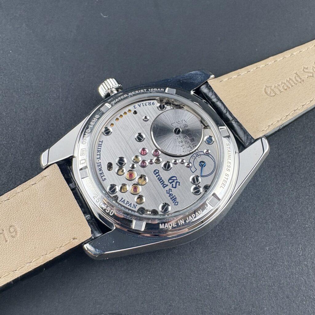 手巻きムーブメントは、自動巻きローターに隠される部分がないため、地板や受け(ブリッジ)の仕上げを全面的にお楽しみいただけます。実際に店頭でご覧いただくと、グランドセイコーの職人たちが丁寧に施した面取りや鏡面仕上げは、まさに工芸品の美しさを感じていただけるはずです。