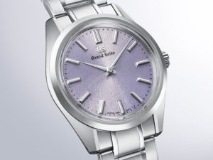 実物を手に取ると分かるのですが、文字盤の美しさには本当に息をのみます。まるで上質な和紙のような、淡い紫の表情。44GSが体現した無数の表情を描く構造を受け継ぎ、現代の解釈を加えた「44GS現代デザイン」の魅力が、ここに凝縮されています。