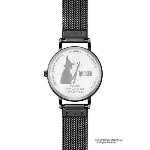 シンシア・エリヴォが演じる“悪い魔女”「エルファバ」をテーマにデザイン。ケースは「エルファバ」がまとう黒いマント、文字板は特徴的な肌の色を表現しています。文字板の背景に描いたパターンで、「エルファバ」が持つ強い魔法の力を演出。6時位置に「エルファバ」のトレードマークである帽子とグリーンのクリスタルガラスをセッティングし、「エルファバ」自身を表現しています。裏ぶたに「エルファバ」のシルエットを刻印。ギフトにもぴったりなスペシャルBOX付きです。