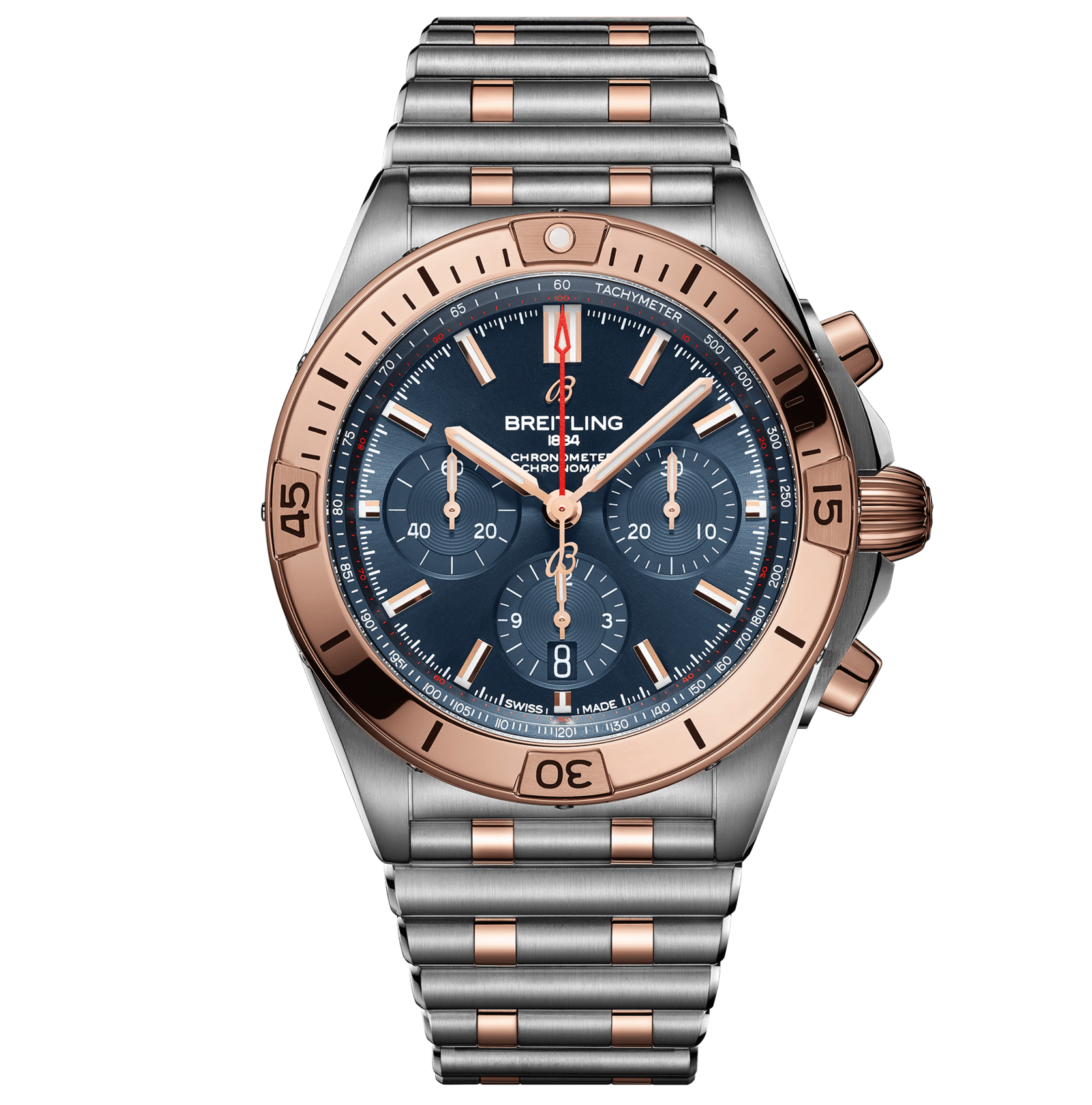 あらゆる要望に応える、ブライトリングの万能モデル。 クロノマットは、ブライトリングの歴史の中で重要な位置を占めるモデルです。発表された1984年は、極薄のクォーツ時計が隆盛を極めていた頃。ブライトリングは極めて印象的な機械式時計で大胆な賭けにでたのです。 かの有名なイタリア空軍とのコラボレーションで1983年に開発・発売されたフレッチェ・トリコローリ・クロノグラフをもとに、クロノマットは100年にわたって築き上げてきたブライトリングのスタイルを祝し、機械式クロノグラフをブランドの本来の重要な位置へと連れ戻しました。こうして、この素晴らしい時計に対する世界的な評価が確立したのです。 ステンレススチールや18Kレッドゴールドをはじめ、種々なケース素材を揃えたクロノマットの特徴は、42ミリケースと4カ所にライダータブを配したアイコニックなベゼル。ダイアルには、ブラック、ブルー、シルバー、コッパーの各カラーをご用意。どのバージョンにも、独特な「ルーロー」ブレスレットがしっくりと馴染みます。クロノマットのムーブメントはCOSC公認クロノメーターのブライトリング自社開発製造キャリバー01です。