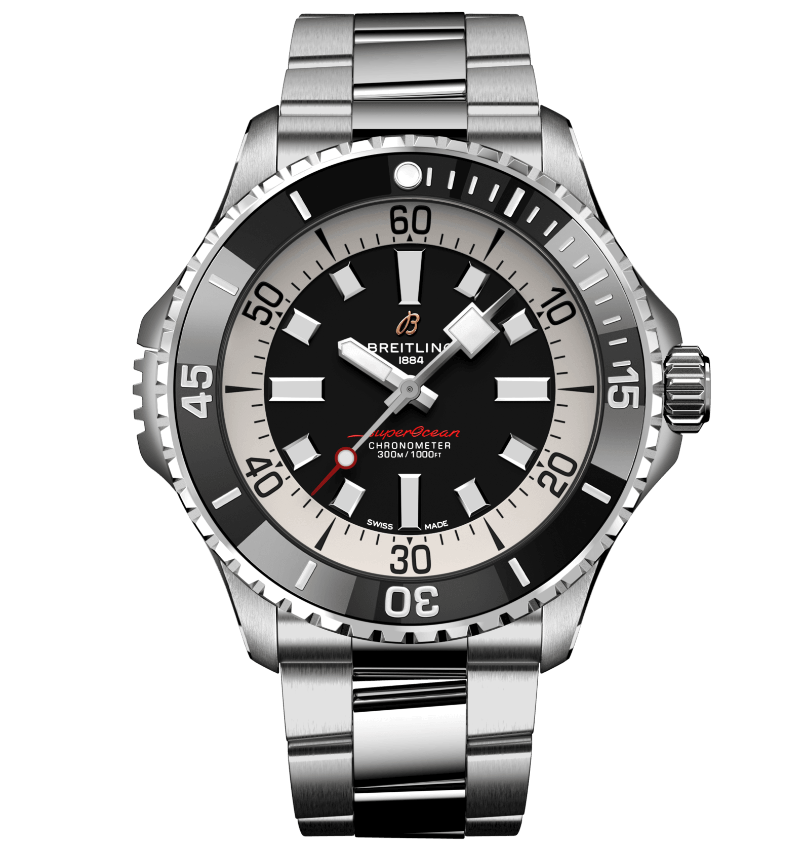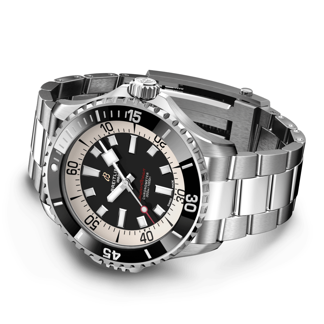 新しいスーパーオーシャンは、人気の高かったスローモーションのデザインコードを踏襲しながらも、セラミックインレイベゼルや鮮やかな色のダイヤルなど現代的な特徴を加味しています。幅広の針とインデックスには蓄光塗料スーパールミノバ?が塗布され、水中でも読み取りやすくなっています。