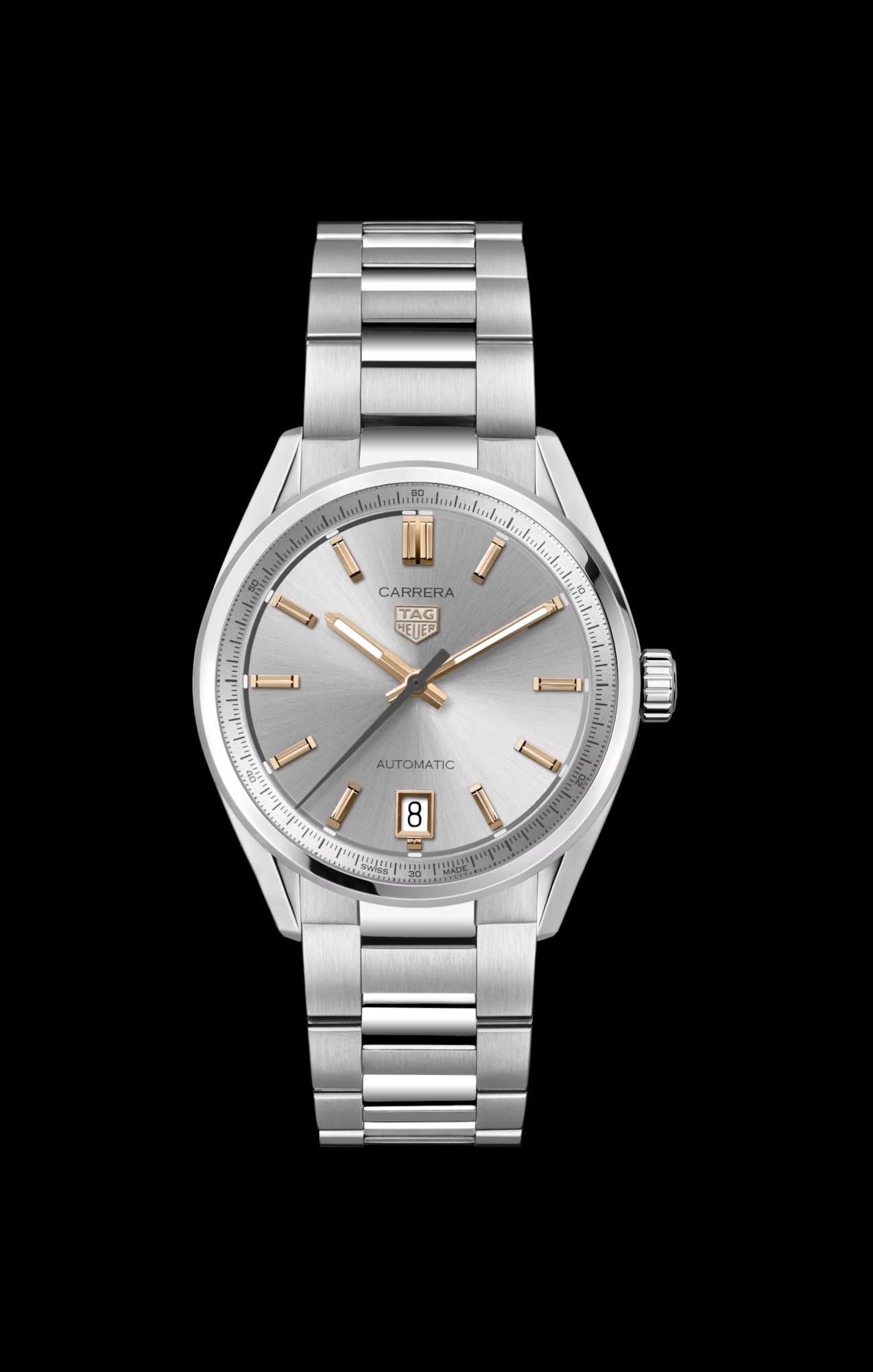 • より薄くなったラグを備えた、超エルゴノミックなタグ・ホイヤー カレラ デイト。エレガンスとコンフォートの完璧なバランスを湛えたウォッチです。堅牢なステンレススティールのデザインに、フランジに沿って施されたリングの明暗のグラデーションといったディテールが、高貴な雰囲気を与えています。