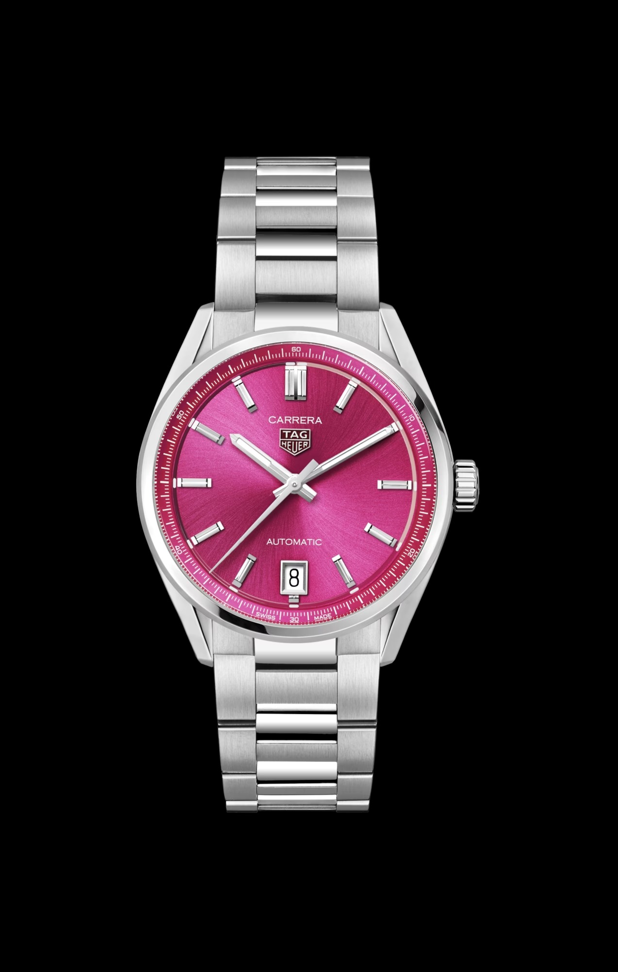• 誇り高く鮮やかなピンクのダイヤルが、このタグ・ホイヤー カレラ デイトの個性を決定づけます。大胆で、どんな挑戦にも対応する、ステンレススティール製ウォッチ。身に着ける人の個性を表現する、情熱のアイコンです。