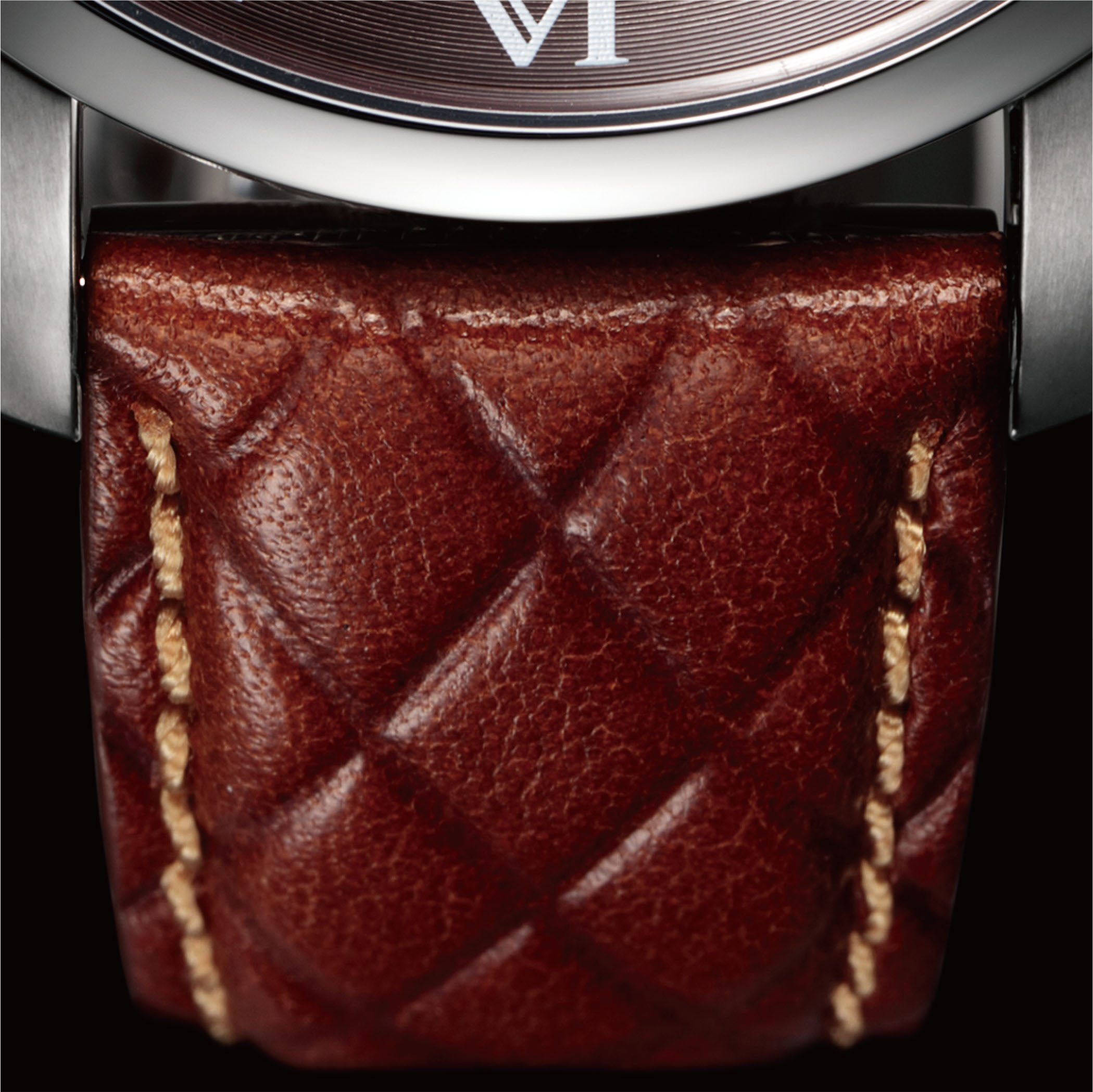 • ・金属粉を混ぜた淡い茶色の漆を塗り重ねて磨き上げた木目のような文字板に、マットゴールドカラーの五徳リングを組み合わせ、華やかでモダンな印象を演出