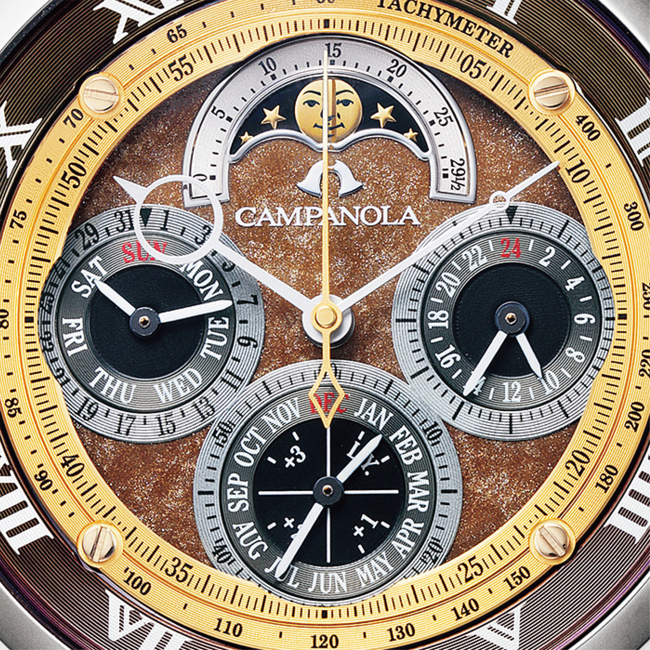 • ・音で時刻を知らせる「ミニッツリピーター」、月の満ち欠けを表示する「ムーンフェイズ」、2100年2月28日まで、うるう年などの月末カレンダー修正を自動で行う「パーペチュアルカレンダー」、通常計測に加えて積算計測、スプリット計測が可能な「クロノグラフ」の4 大複雑機構をクオーツウオッチで実現