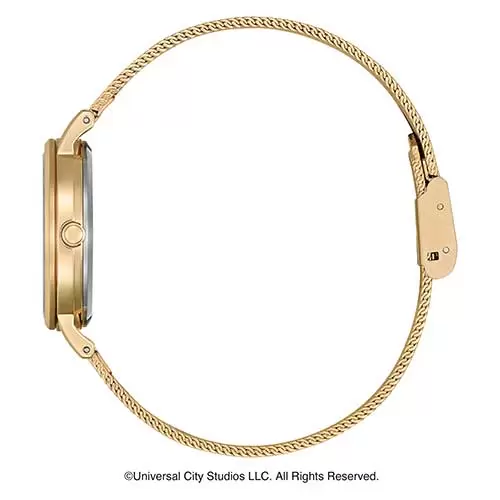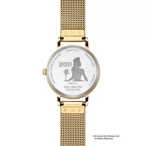 アリアナ・グランデが演じる“善い魔女”「グリンダ」をテーマにデザイン。ケースは「グリンダ」の金色の髪、文字板はピンクのドレスを表現しています。みんなの人気者「グリンダ」を表現した華やかな文字板。くるんとしたディテールが可愛いインデックスの背景にハートをモチーフにしたパターンを描き、4時位置には魔法の杖をイメージしたワンポイント、10時位置には蝶をあしらっています。裏ぶたに「グリンダ」のシルエットを刻印。ギフトにもぴったりなスペシャルBOX付きです。
