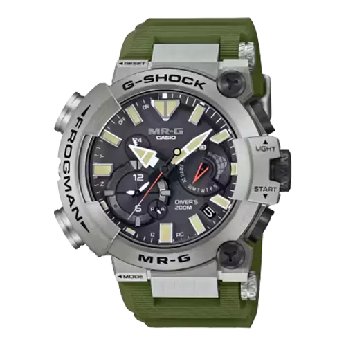 ISO規格200m潜水用防水機能を持つダイバーズウオッチ「FROGMAN(フロッグマン)」にチタン外装を採用し、丹念な仕上げを施してつくりあげたMR-Gです。