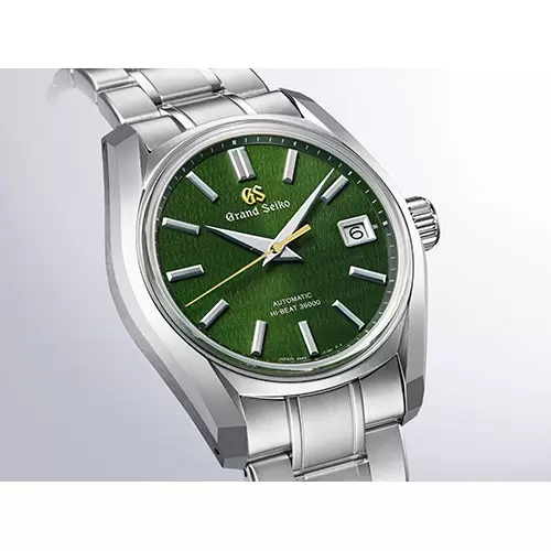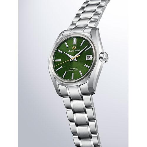ムーブメントは、「グランドセイコースタジオ 雫石」で熟練の匠の技によって組み立てられた10振動のメカニカル・キャリバー9S85を搭載。工房近くの青々とした草原を通り抜ける穏やかな風を想起させる、鮮やかなグリーンダイヤルが特徴です。