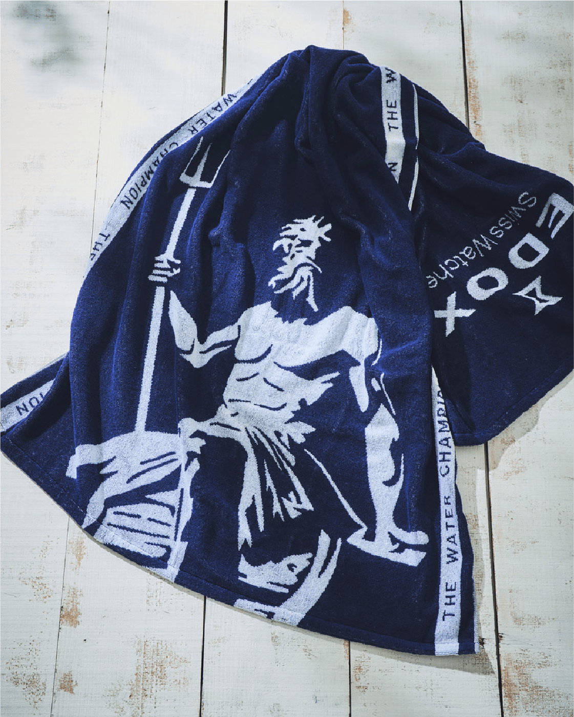 ネプチュニアン コレクションの裏蓋に刻印されている海の神・ネプチューンをジャガード織で表現したビーチタオル。