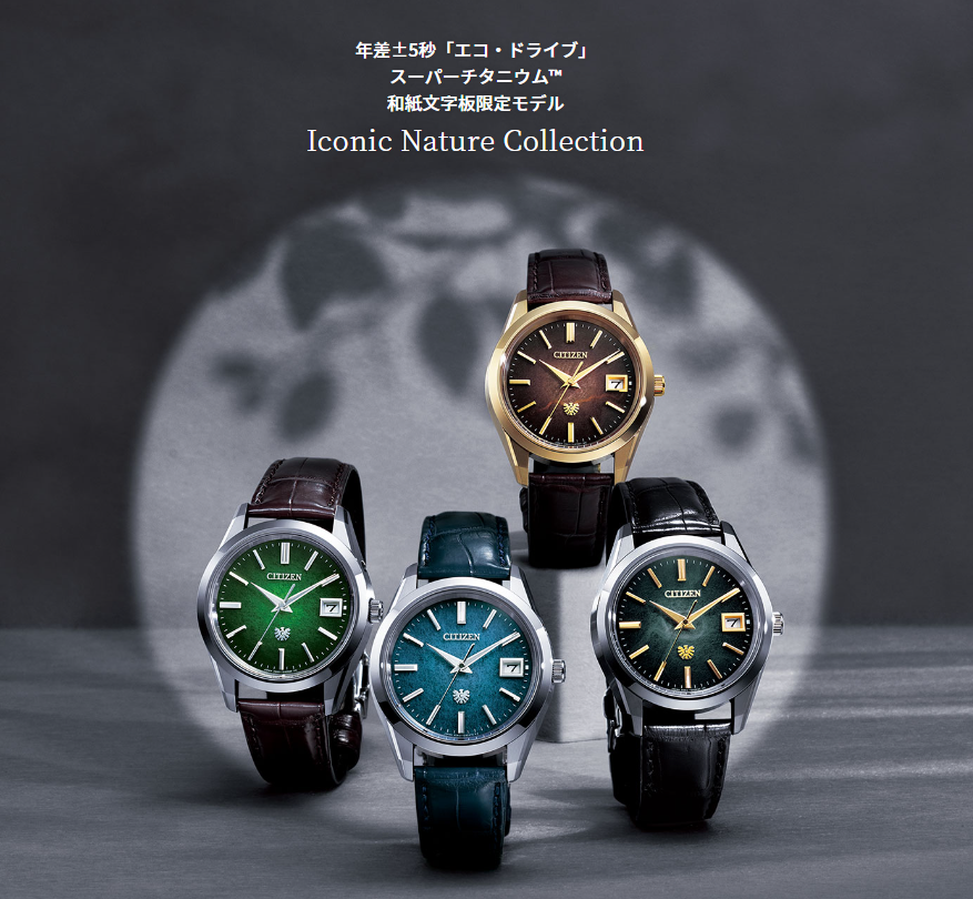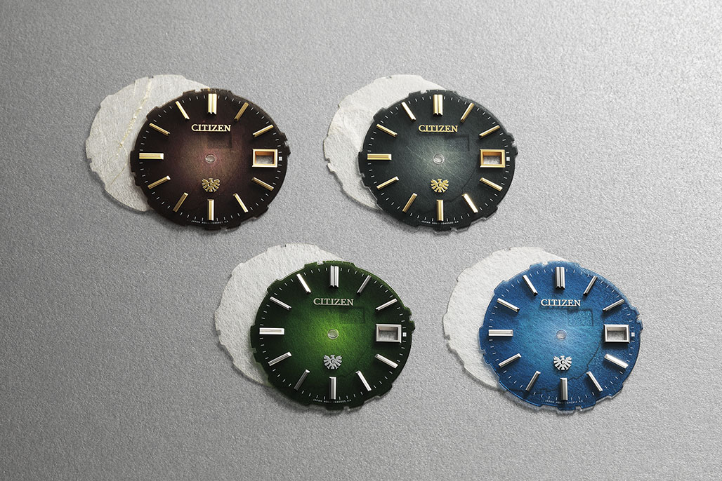 文字板の中に四季の繊細な陰影の世界を表現すべく、日本三大和紙の1つ「土佐和紙」を採用。その中でも、各モデルの世界観にあわせて、極薄で独特の風合いを持つ「典具帖紙」、繊維を砕かず塊の状態を残した「雲龍紙」の2種類を使い分けています。雲龍紙に漉きこまれた長い繊維(雲龍)の配合量はシチズンオリジナル。美しく雲龍が入っているものだけを吟味し、理想の文様表現に徹底してこだわりました。