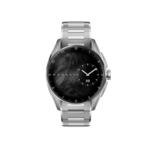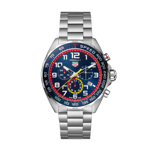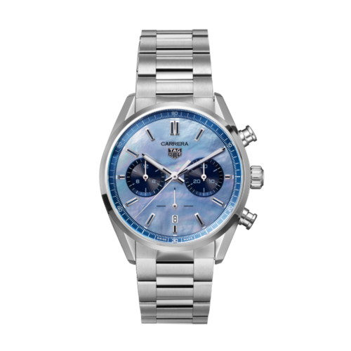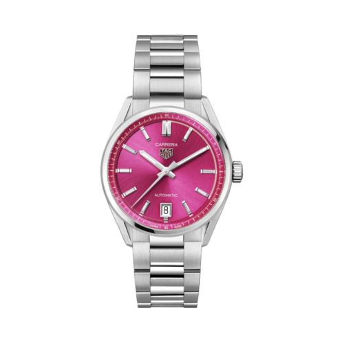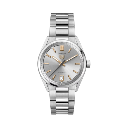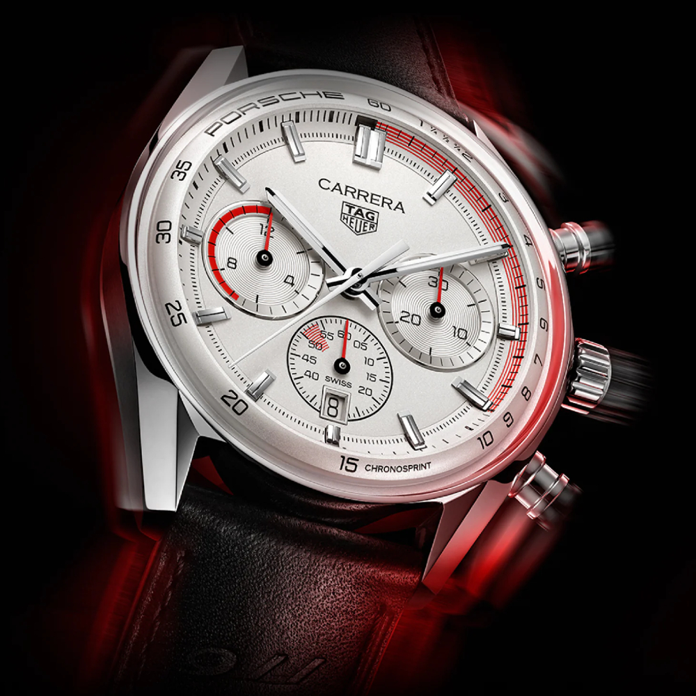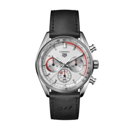 レッドのハイライトが全体に施された、輝くシルバーのタイムレスなカレラは、フランジにポルシェにインスピレーションを得たブラックの60秒スケールを備えています。