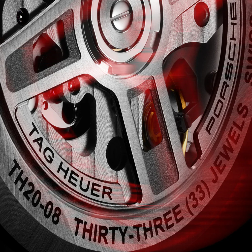タグ・ホイヤー カレラ クロノスプリント × ポルシェに搭載されたキャリバーTH20-08は、TH20-00を改良したもので、初期のポルシェ911からインスピレーションを得ています。クロノグラフの動きが特徴的で最初の0秒から9.1秒まで早く動く仕組みは手に取ってご覧いただく価値のある逸品です。