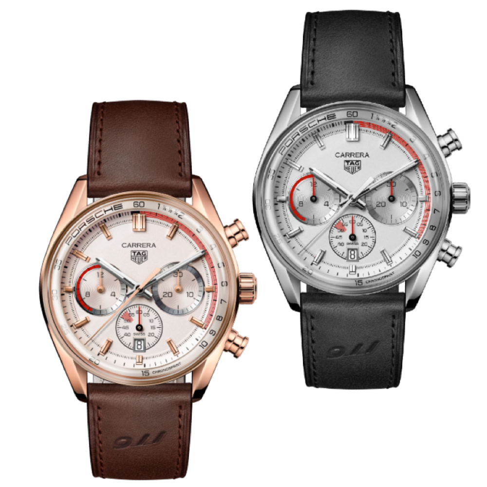 タグ・ホイヤー カレラ クロノスプリント × ポルシェは2つのデザインで展開。ステンレススティール製と、18K 5N ローズゴールド製のケースのモデルです。