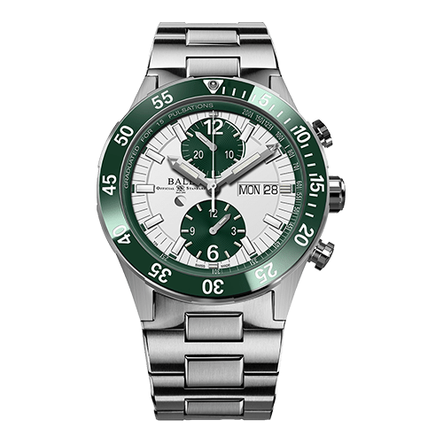 世界限定1000本、ボールのイメージカラーのグリーンとホワイトを使った爽やかなダイヤル。ひねることでロックのかかるプッシュボタンや、